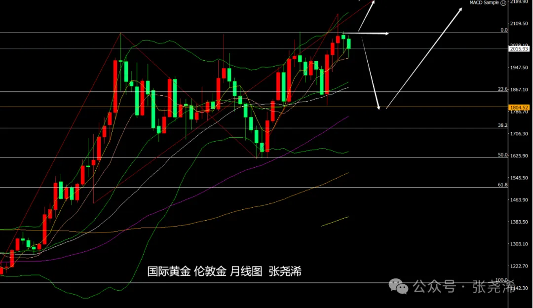 技术上:月图级别,金价连续两度收取反弹高位的见顶形态,本月走势也跟随其压力表现走弱,虽目前触底回升走盘,但只要不反弹突破持稳2075美元上方,则仍暗示后市将有较大的回落空间风险;
