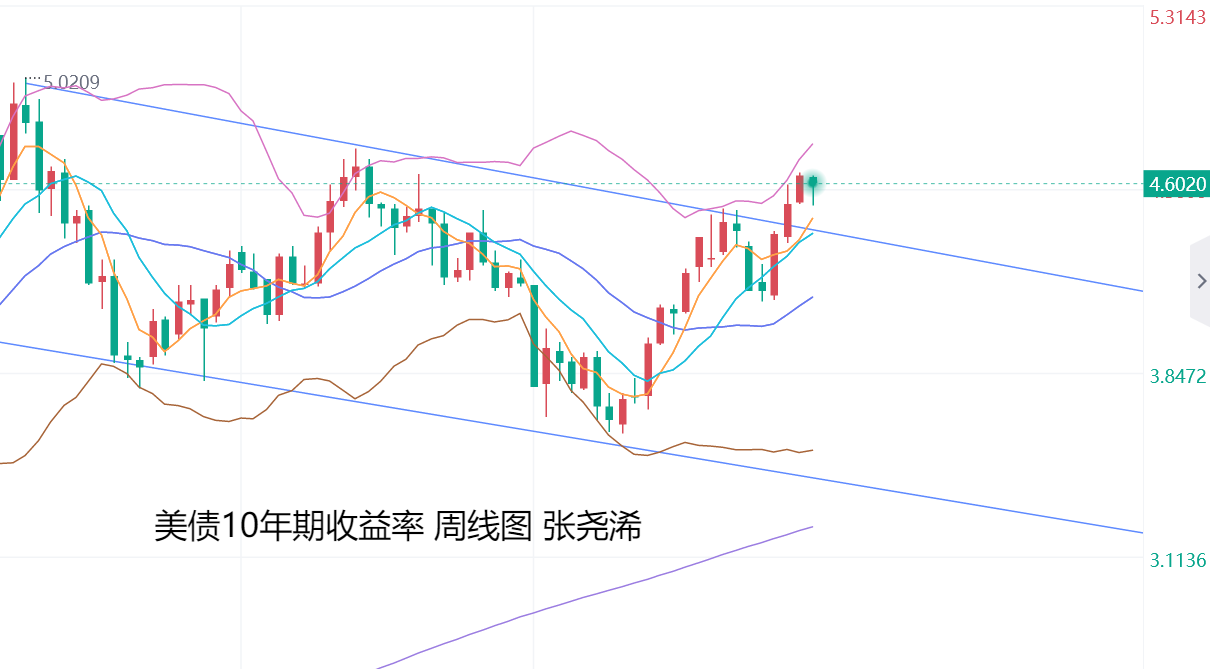 美债10年期收益率,日图自触及布林带中轨之后再度走强,同时布林带在缩口之际,也有望再度向上扩散,这将令多头力量加强,并有望继续走强,周图也仍维持在回落趋势线上方,前景看涨。