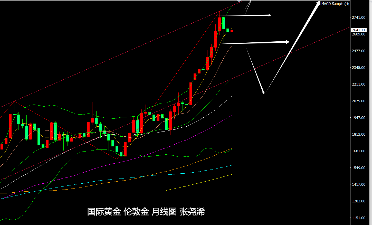 下方关注10月均线支撑,跌破将进一步下探中轨线或60月均线支撑位置,上方关注2750美元区间阻力,突破则有望进一步触及3000美元关口或更高。