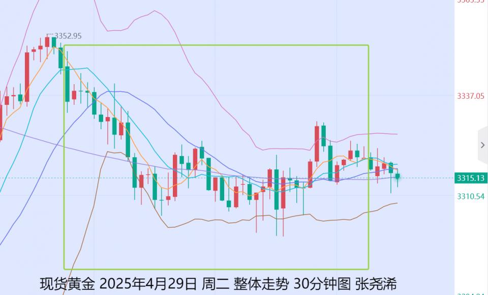 上交易日周二(4月29日):国际黄金遇阻回落收跌,继续维持近期的震荡走盘格局,但仍收线在扩展线及其区间震荡支撑上方,以及布林带仍向上延伸,基本面前景也仍利好金价,暗示后市在震荡调整之后,仍有再度走强的预期。
