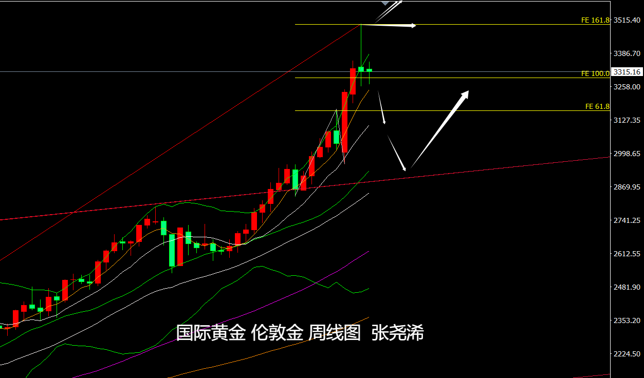 但鉴于布林带仍保持向上延伸,5-10周均线向上排列反弹趋势维持,目前走势也未跌破5周均线支撑,故此,空头力量未能增强,并有再度回升至3400美元上方的预期,且如有再度回落走低,下方关注回踩5/10周均线支撑也可再度看涨攀升。