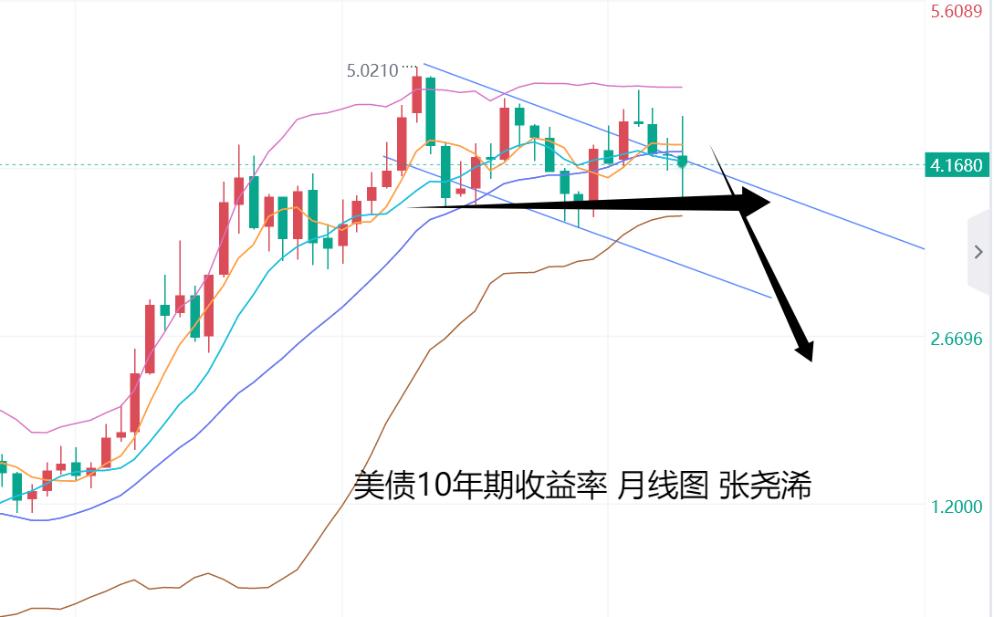美债10年期收益率,日图走势再度运行在200日均线下方,附图指标也维持空头信号发展,暗示后市有继续走低下行的风险,而会支持金价,另外,月图级别也仍处于一年半多以来的顶部背离走势,也暗示后市将有一波熊市的回落行情,而会支持金价。
