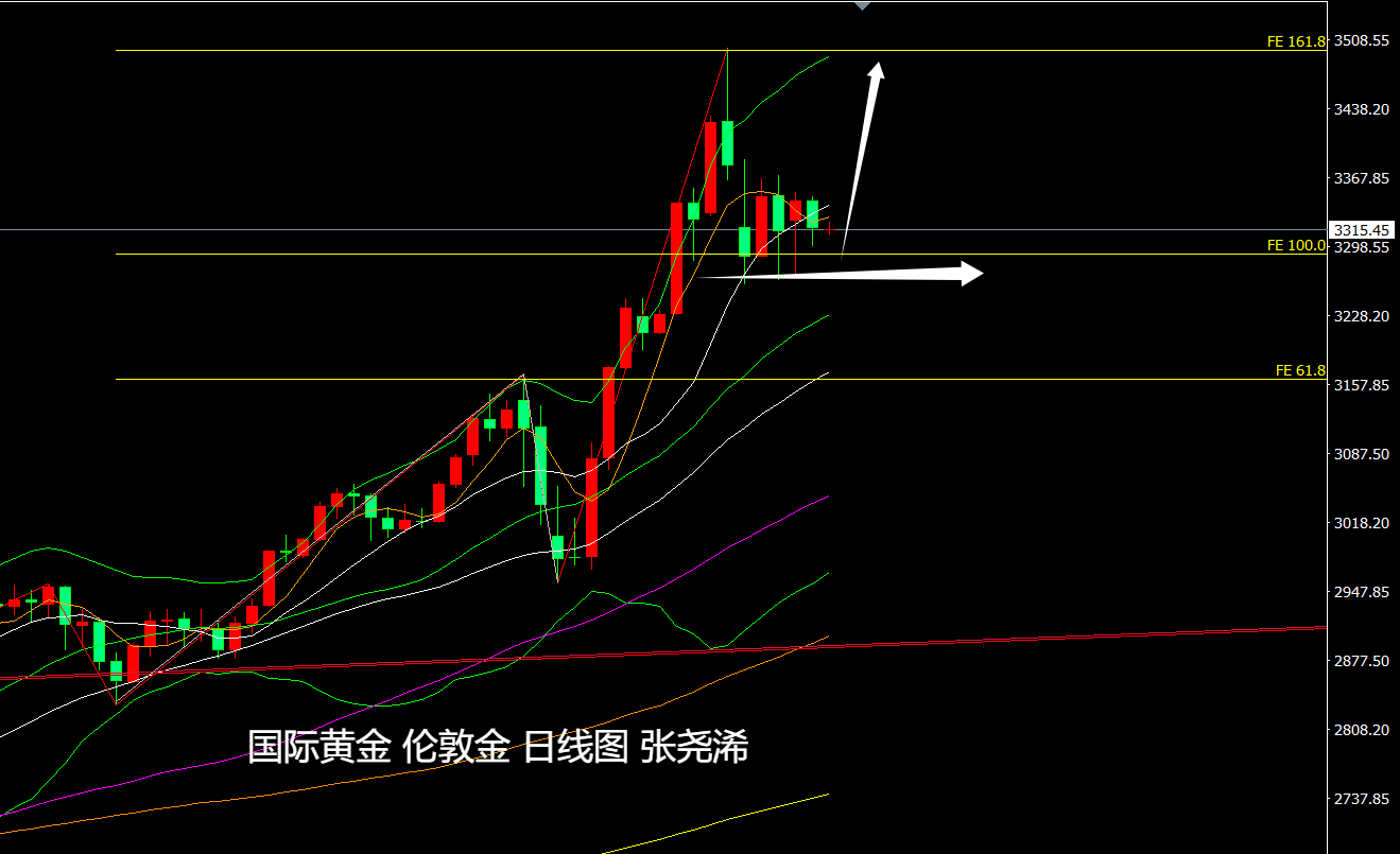 日图;金价目前仍维持震荡区间调整走盘,但最终都触底反弹,且也未跌破扩展线支撑,布林带也在向上延伸,中轨线和30日均线支撑也在逐渐拉高,暗示下方支撑力度不断加强,5-10日短期均线也开始向上,暗示后市在震荡调整之后,大概率有望再度走强,再探3500美元关口。