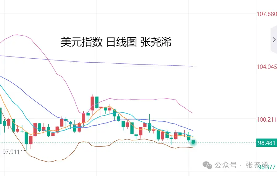 美元指数,日图近期虽止跌盘整,但仍受到中轨压力,多头未能增强,昨日走势又回落收跌至5-10日均线下方,今日走势也继续偏弱运行,令空头力量加大,那么,目前来看,布林带再度开口倾向下移,附图指标空头信号开始增强,后市看空预期加大,故此将会对金价造成利好支撑,使得金价仍具看涨动力。