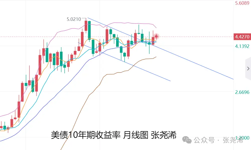 美债10年期收益率,日图昨日回落收跌,周图维持走低状态,对本周金价造成利好支撑,另外,月图走势的2年背离行情,仍暗示后市有望走出一段持续的下跌行情,而会对金价造成较大的利好推动。