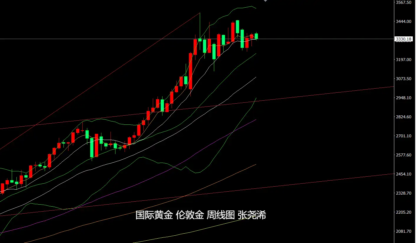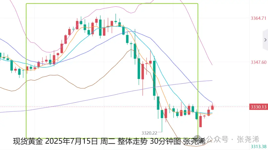 之后美盘开盘,空头力量加大,美国6月整体CPI小幅反弹,高于前值,减弱本月降息前景,打压金价回落走低,再加上美财长称中美谈判“态势良好”,利空金价连续走低,于次日0点时段录得日内低点3320.12美元,最后有所触底回升,并窄幅盘整,最终收于3324.74美元,日振幅46.25美元,收跌19.29美元,跌幅0.58%。