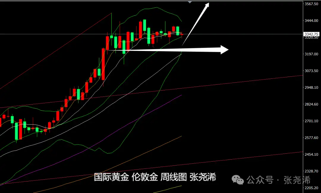 周图,金价自去年开涨攀升以来,如期第4次再度回踩中轨线支撑,并展开震荡调整行情,按照历史规律,震荡调整之后将再度向上攀升。