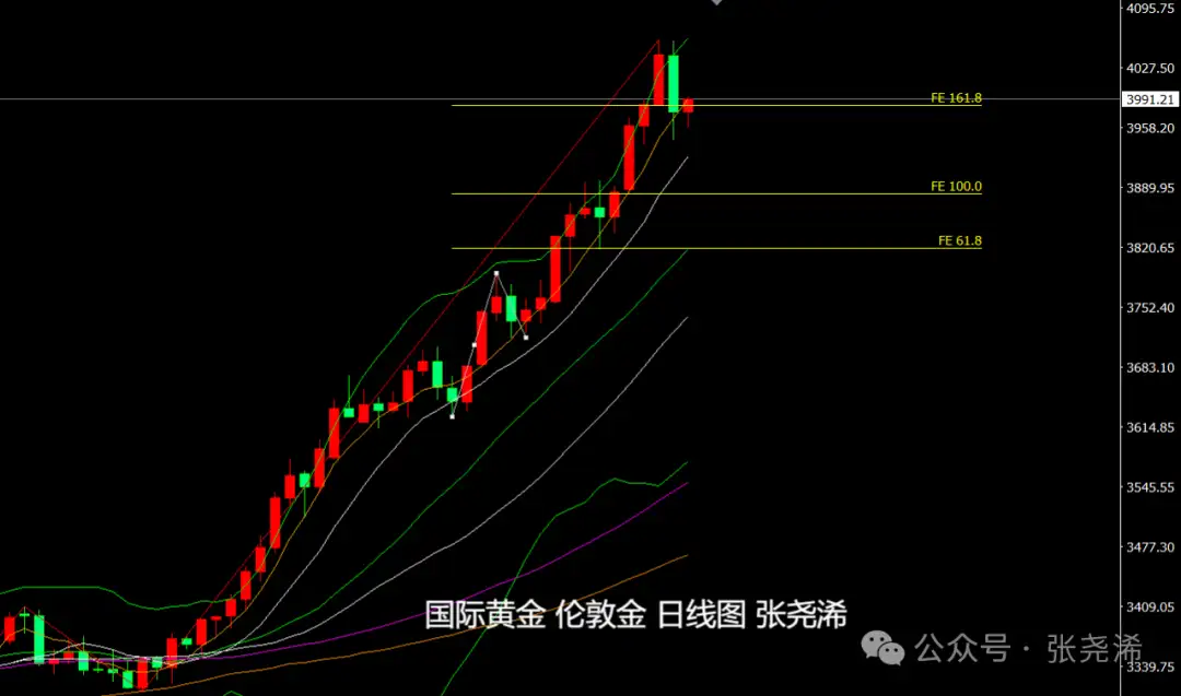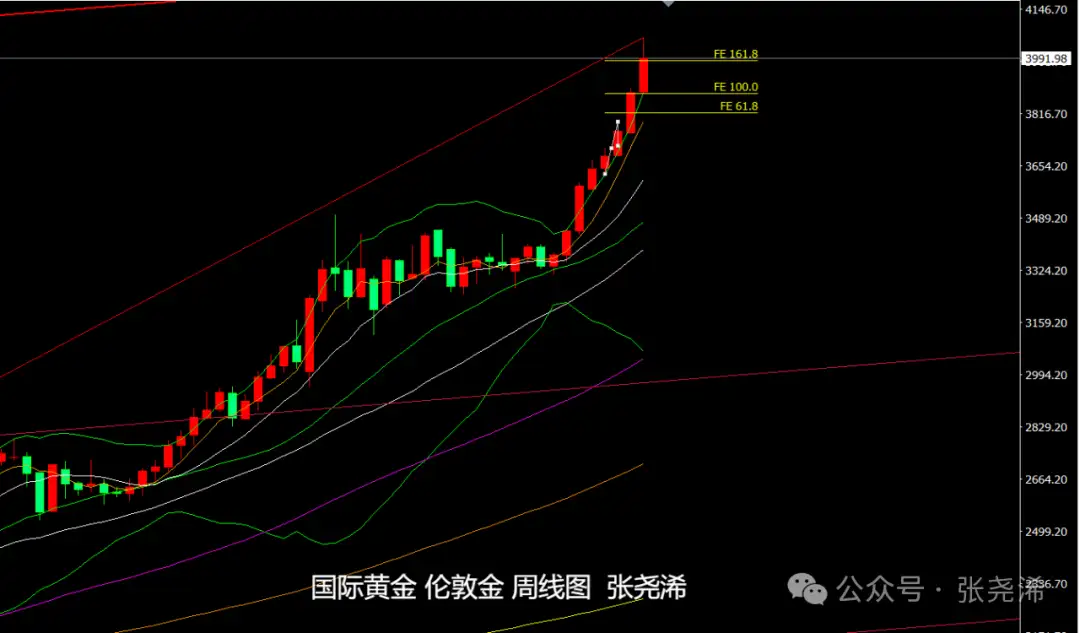 周图,金价自去年开涨攀升以来,如期第4次回踩中轨线支撑,并再度展开持续向上攀升的多头行情,不断到达给出的看涨目标位,本周强势运行在布林带上轨之外,昨日也如期走出了回调行情,本周重点留意是否能收取倒垂见顶形态,来判断下周将在何处支撑再度看涨,如持稳收在3980美元上方,则下周可继续看涨,反之下周将面临回落触及3882或3820美元附近支撑后再度看涨攀升。