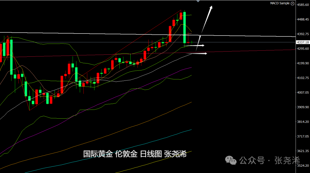 日图;金价今日高开走强,但仍需关注4400美元阻力,在突破此阻力持稳之前,仍具回落风险,同时也需留意高开缺口的回补,但从其形态是走势来看,后市偏向筑底波动,持续收取止跌看涨的形态为主,故此,个人判断下方空间有限,仍遵循在触及每一个支撑位置先行看涨。
