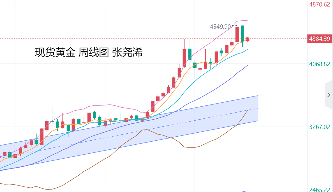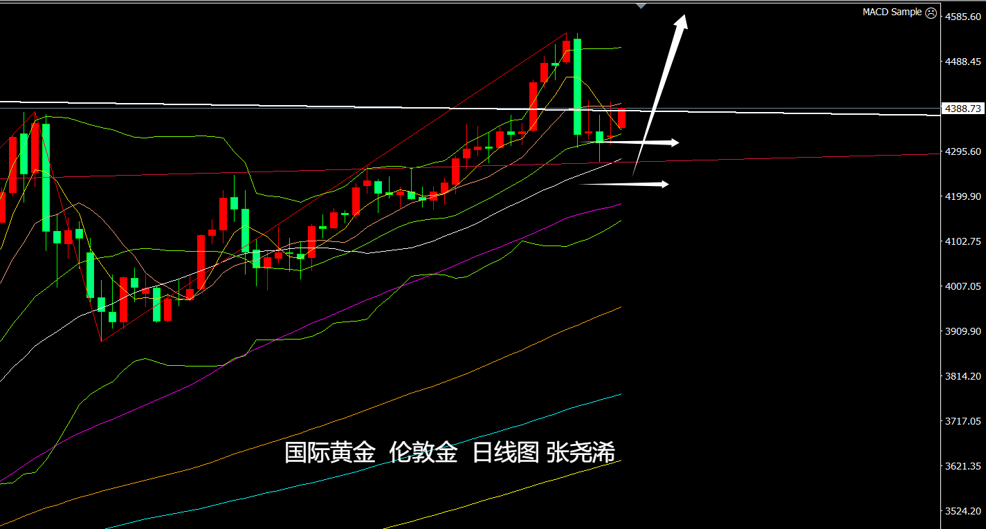 黄金市场上周:国际黄金大幅回落收跌,一举收复前周跌幅,形成阴包阳的见顶看空头形态,令后市有继续走低调整的风险预期,但上升趋势及看涨前景依然良好,故此,如有进一步走低,下方关注布林带中轨支撑附近,也是再度入场看涨攀升的机会,反之如重回4400美元上方收线,则可顺势看涨上行。