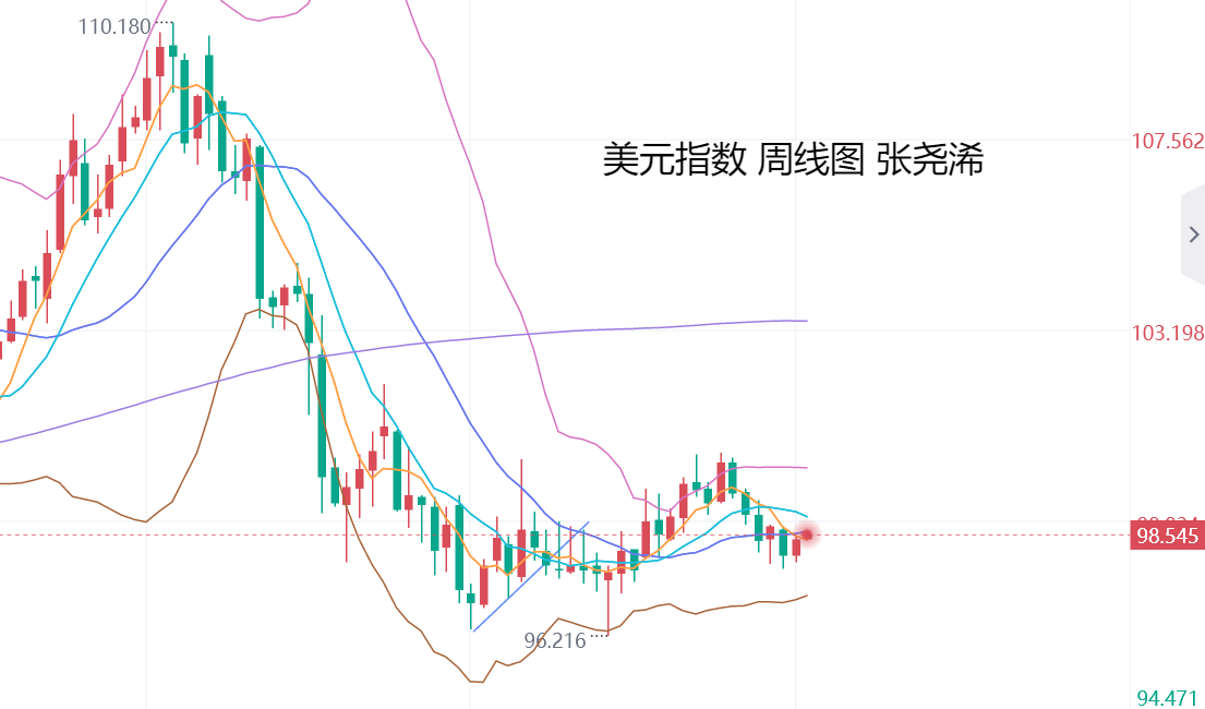 周线级别,金价上周遇阻回落转跌,相对于前周形成阴包阳看空回落的预期,暗示后市将有继续走低触及10周均线4230美元乃至中轨及30周均线支撑位置4000美元关口附近或下方的预期,但由于走势趋势向上,均线多头排列,故此,如有进一步调整触及各均线支撑目标,也是先行入场看涨的机会。