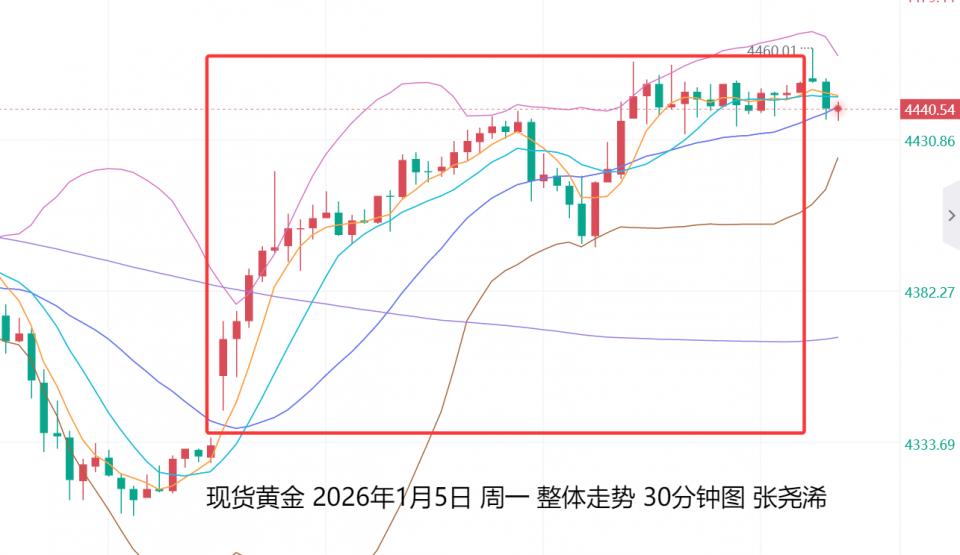 上交易日周一(1月5日):国际黄金随着委内瑞拉局势增强,贵金属的避险吸引力展现,推动金价高开高走,一度站上4450美元关口,创一周新高,并收复上周五回撤幅度,并重新站上10日均线之上,多头动力加强,下方将再度依托5-10日均线支撑进行低多看涨操作,但也需留意缺口回补而进行的跳水走低风险,以及再度的入场机会。