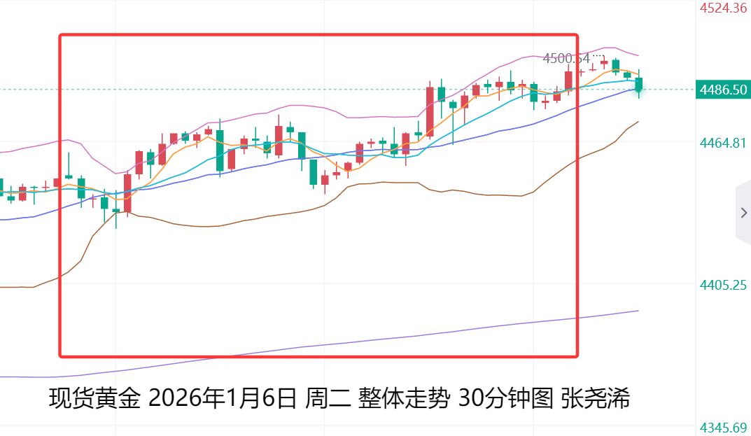 上交易日周二(1月6日):国际黄金继续反弹收涨,稳于中轨及短期均线之上,多头继续占据优势,也令后市有继续走强刷新历史新高的预期。虽有高空缺口待回补,但参考2024年4月高开的缺口仍然存在,故此周内如回补不了,后市就难以或不会回补,故此,在跌回4400美元下方前,仍保持看涨预期不变。