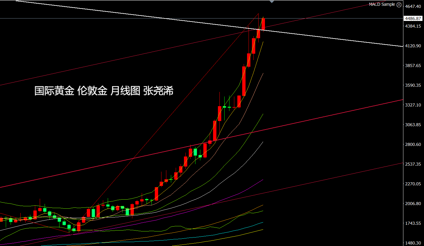 反之,如本月再度收取倒垂至趋势线之内,则需留意后市有再度展开较大回调,去回踩4000-3900美元区域或更低位置的风险;