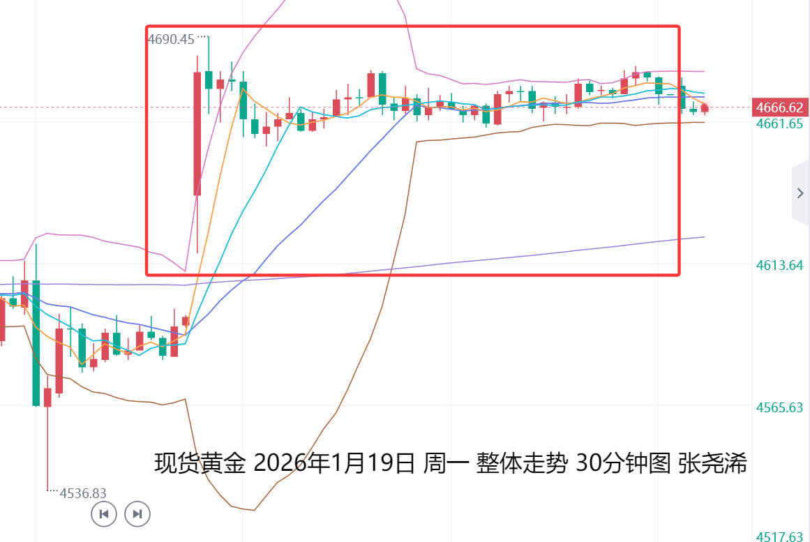 上交易日周一(1月19日):国际黄金受美国总统特朗普在格陵兰岛争端中对多个欧洲国家发出加征关税警告所激发的避险需求推动,高开高走,再度收阳,维持多头看涨前景,但目前走势触及上升趋势线压力附近,也有短线回落调整的需求,不过,如有回撤调整,下方各短周期均线支撑,也是再度入场看涨的机会,反之,如继续反弹走强收阳至趋势线阻力上方,则将顺势跟进继续看涨上行。