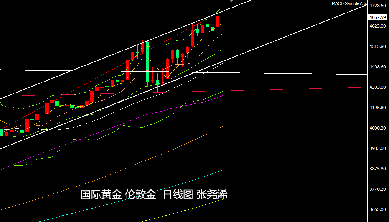 具体走势上,金价自亚市高开于4615.41美元/盎司,先行录得日内低点4615.08美元,之后反弹拉升,触及日内高点4689.23美元,半小时内即出高低点,在之后,多头动力有所减弱,并维持基本维持在4655-4677区间内持续盘整,一直到日收盘,收于4671.91美元,相对于上周五收盘价4594.07美元,周振幅95.16美元,收涨77.84美元,涨幅1.69%。