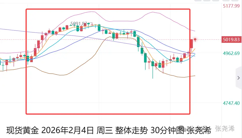 上交易日周三(2月4日):国际黄金高开后,最终震荡十字收平,但仍处于中轨上方,后市仍具走强前景,如收线在5100美元上方,多头动力则稳健加强,可跟进看涨新高。
