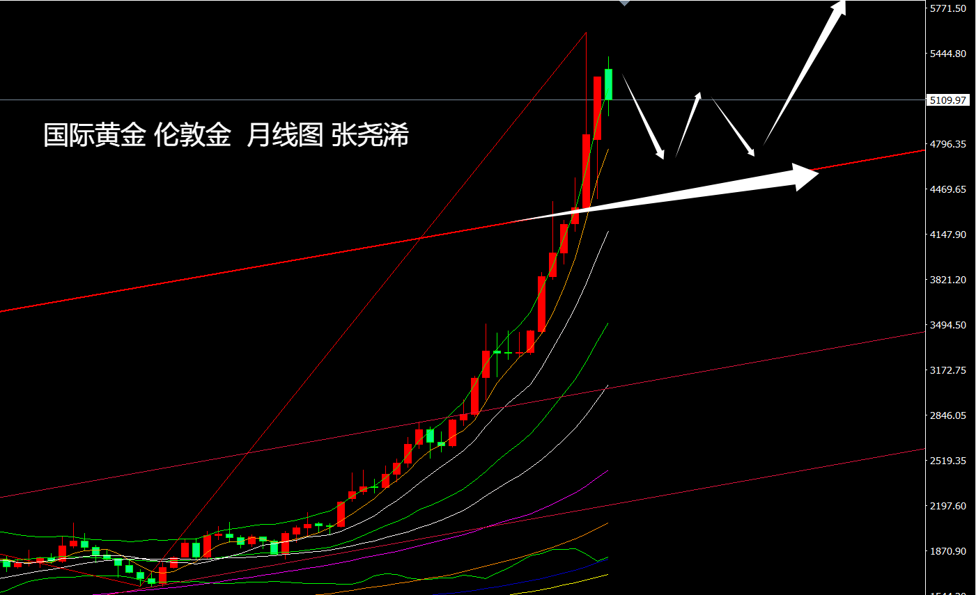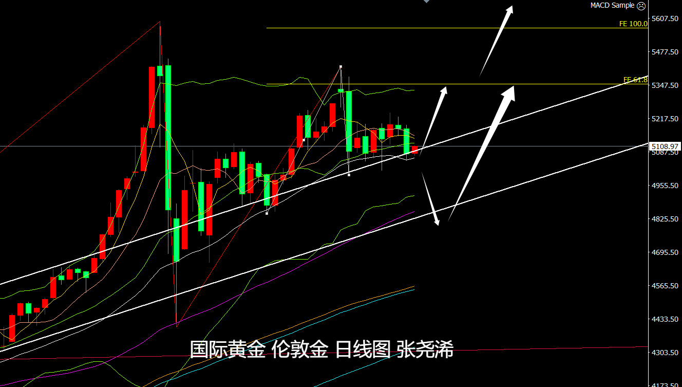 反之如跌破趋势线支撑收线4300关口,则暗示牛市结束,将进一步跌至3500美元乃至更低位置3000关口。但目前来看,此概率较小。