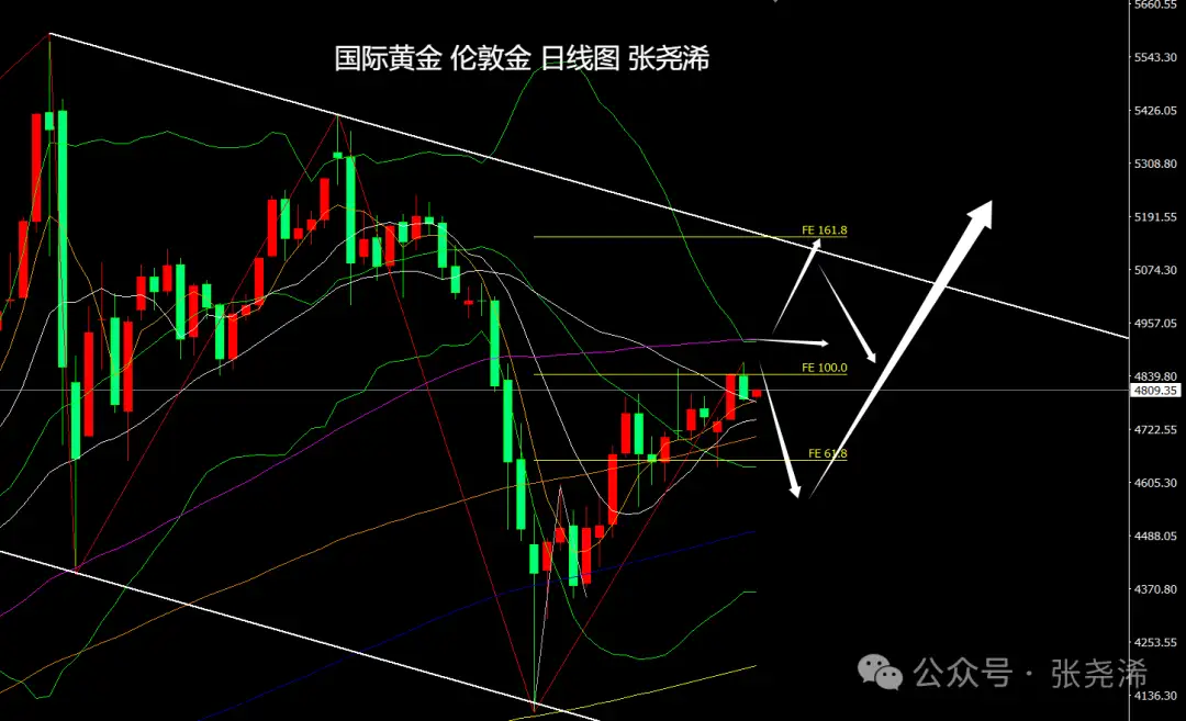 周图级别,金价本周维持反弹动力,但仍受阻于10周均线压力,在突破10周均线收线之前,仍面临回落调整至4450美元附近的风险。如突破10周均线阻力,则有望再度刷新历史高点。