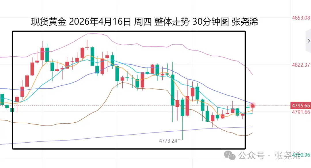 上交易日周四(4月16日):国际黄金先行反弹后回撤,倒垂收平,仍未能突破阻力,虽然美伊正在进行停火谈判的发展趋势,但各方态度强硬,仍随时会再度重启战事的倾向,加上美盘初请等数据好于预期及前值的利空压力,暗示短期继续面临调整走低风险,但走势运行在中轨及100日均线上方,下方均线支撑众多,看涨前景仍具优势,故此,如有回撤,下方各均线支撑,仍是入场做多机会,继续等待反弹触及60日均线目标4920美元,以及5100美元附近。
