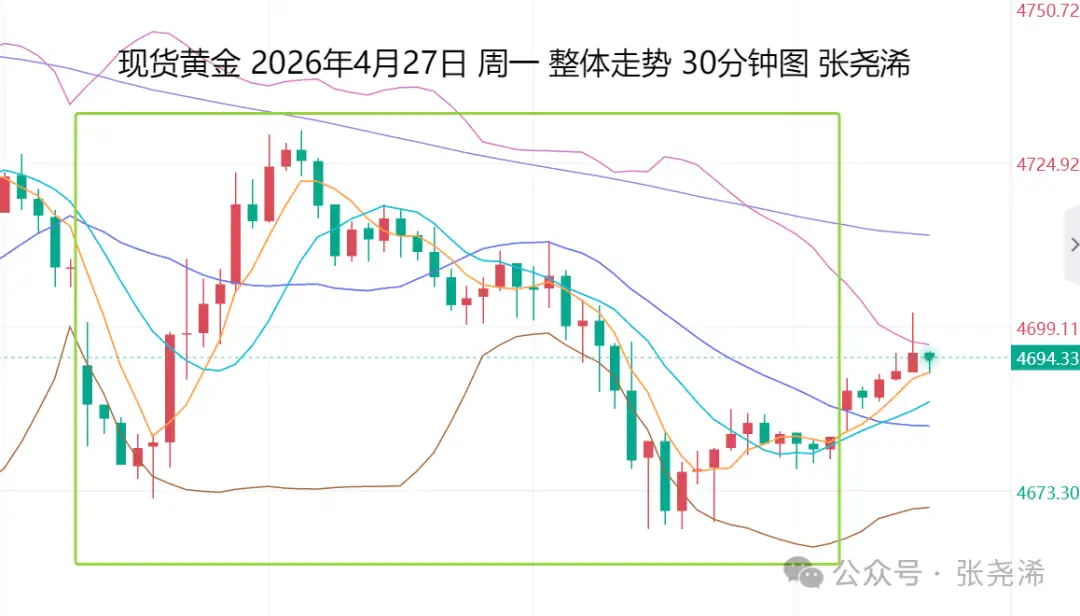 上交易日周一(4月27日):国际黄金震荡收跌,美伊海峡的博弈问题持续,令金价维持调整状态,并继续运行在100日均线及中轨线下方,空头仍占据优势,暗示短期仍有望回撤至4550美元或更低位置的预期。