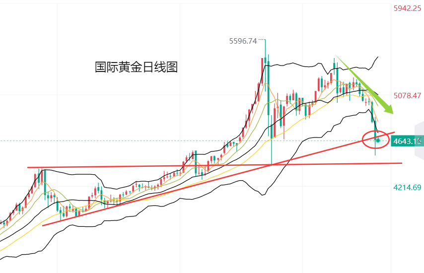 从之后的走势看,昨日周四亚盘开盘后,黄金回落4804美元企稳,反弹4866美元遇阻,欧盘开盘后,黄金向下突破,失守4800美元整数位置,此后一路向下,一直到美盘开盘后,刷新日低至4502美元,大跌超过300美元,此后金价企稳反弹,收盘价4650美元,收回近半跌幅。总体来看,黄金承压下跌,延续了之前的回落趋势,短期跌幅略超预期。