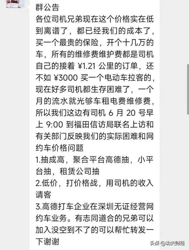 在深圳的司机群里,一些司机说:“高德打车为了市场份额运价一降再降……其恶意倾斜行为极度拉低网约车整体运价”。