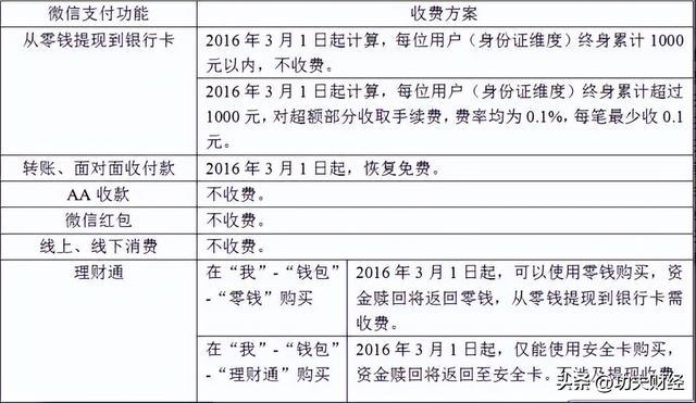 2016年2月,微信支付发布公告,自3月1日起,微信支付将对超额提现交易收取手续费,每个账号仅享有1000元免费提现额度,超过额度后,提现手续费将按照提现金额的0.1%收取。