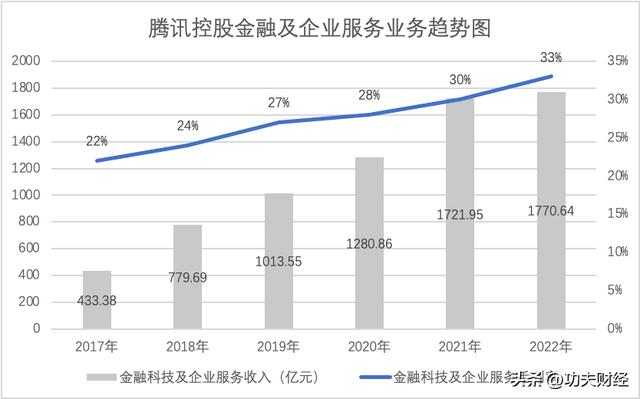 财报显示,2015年-2020年,腾讯金融科技和企业服务业务的毛利率从10%提升至28%,五年时间增长13个百分点。2022年,腾讯金融科技和企业服务业务毛利为583.74亿元,毛利率为33%,对比上年的513.96亿元,增长13.58%。