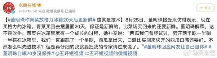 “青菜买回去摆里面20天,保证是新鲜的”,也就罢了。“比菜场买回来的还要新鲜”的灵感大概是董明珠的容颜不老。可是,冰箱再好,也不能给蔬菜做医美啊。