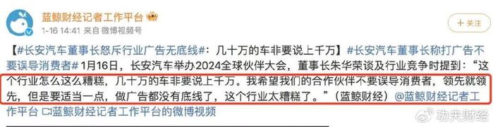 "这个行业怎么这么糟糕,几十万的车非要说上千万,我希望我们的合作伙伴不要误导消费者,领先就领先,但是要适当一点,做广告都没有底线了,这个行业太糟糕了"。