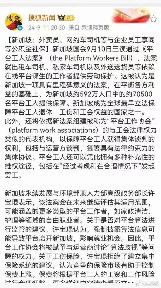 新加坡“出手”了新加坡国会9月10日三读通过《平台工人法案》,法案就出租车司机、私家车司机以及外卖员(统称为平台工人)等依赖在线平台谋生的工作者提供劳动保护。法案将从2025年1月1日起生效,确保平台工人享有比现有水平更高的新加坡中央公积金(包括退休、医疗、住房和家庭保障在内的综合保障体系)储蓄计划保障,与目前的雇员、雇主支付费用标准保持一致。