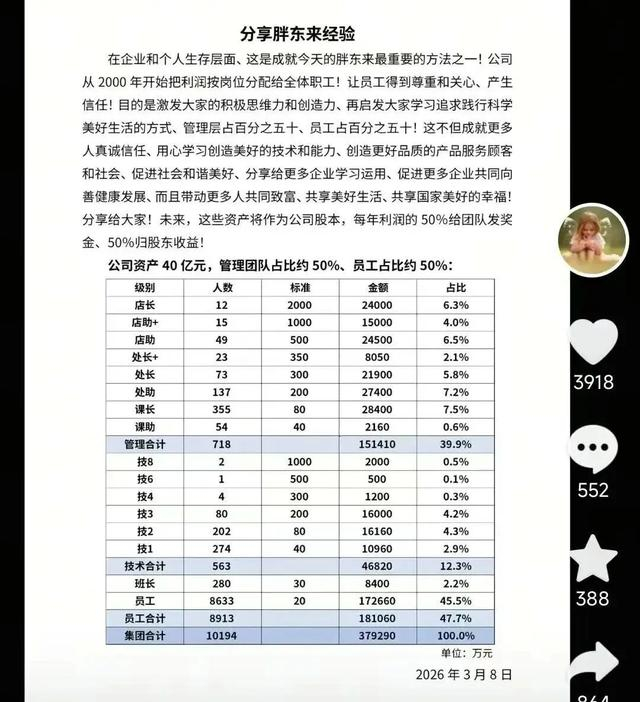 2026年3月8号,胖东来的创始人于东来又往水里扔了两个深水炸弹。第一个是关于38亿资产怎么分,第二个是关于员工休假的调研结果。