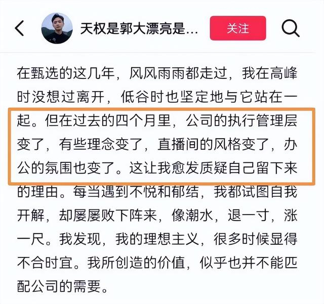 明明说新领导入驻后,公司整体直播模式与运营风格彻底改变,天权说过去的四个月里,公司的执行管理层变了,有些理念变了,直播间的风格变了,办公的氛围也变了。