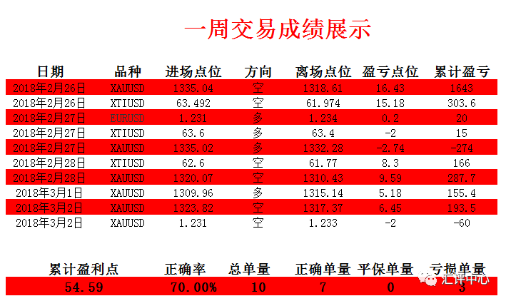 2月26日-3月2日当周,FED新主席鲍威尔证词乐观,美指一度升向91,金价重挫约30美元逼近1300美元关口,但随后特朗普掀起贸易战危机,打压美元并推升避险情绪,黄金逆袭20余美元,周线收跌0.48%,报1322.17美元;目前市场关注意大利大选,政治不确定性高企。而当周我们的交易也算是一波三折,最长持仓单超过24小时以上,但总体交易情况算好,不负众望!