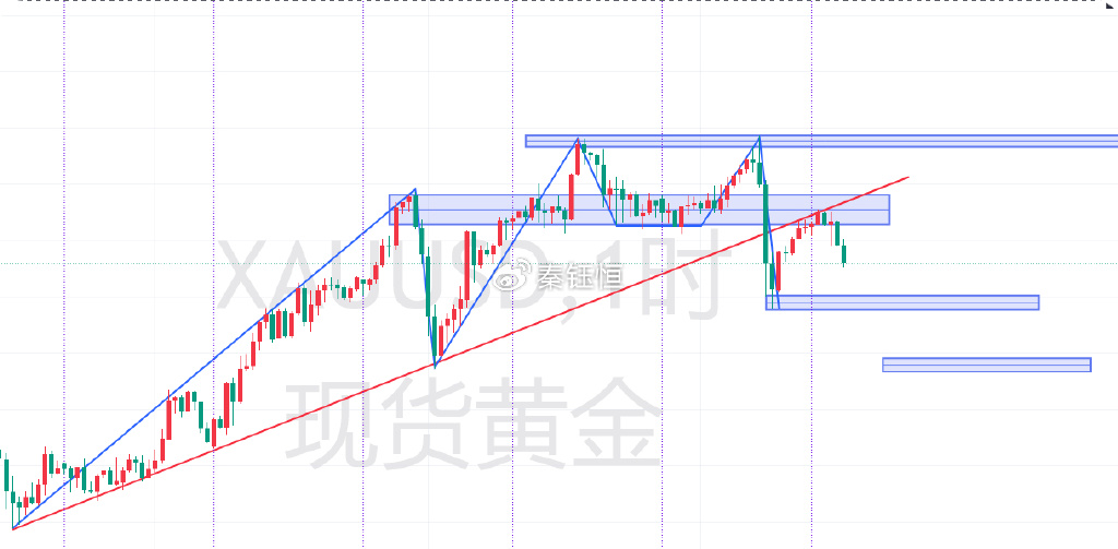 经过连续两次跳水洗盘,市场多头动能明显减弱。昨日冲高仅形成刺破便迅速回落,四小时级别更形成M头下破形态,短期上升快速趋势线已被跌破。今日早盘我在微博已提示:当前市场需要构筑底部结构才能重启升势,日内承压明显,多头需谨慎规避风险,未确认企稳前不宜轻易进场。