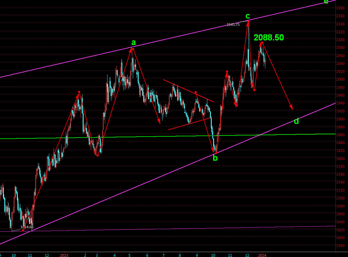 本周周评《【格物金融趋势文章495】黄金春节周下破2000美元之后,黄金后市解析》提到整体还是下探为主,2035压制继续下跌,即1973-2001.75的连线压制。观点基本不变,今天的话,首先就是昨天的高点压制继续下跌,如果没有成功的话则是回踩2030之后以2035为压制继续下跌,下方的话关注2010美元这个位置,上周1984的反弹到2010压力回踩过一次1995美元,而本周开盘之后也是这里获得支撑。因此,后面如果2010破位的话,基本就考虑继续向下测试1995的支撑,届时要关注反弹一次。