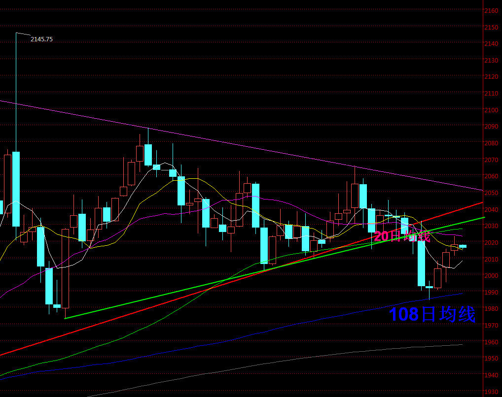 昨日黄金开盘2014.03美元,最高2022.91美元,最低2010.93美元,收盘2017.83美元,报收小阳线,日线录得三连阳,黄金反弹测试20日均线。上周周评《【格物金融趋势文章494】龙年春节周黄金市场走势解析》提到黄金2030上以2035风控继续下跌,但是,没有破位1973之前要注意反弹一次。行情2032.10美元下跌到1984.20美元测试108日均线反弹。