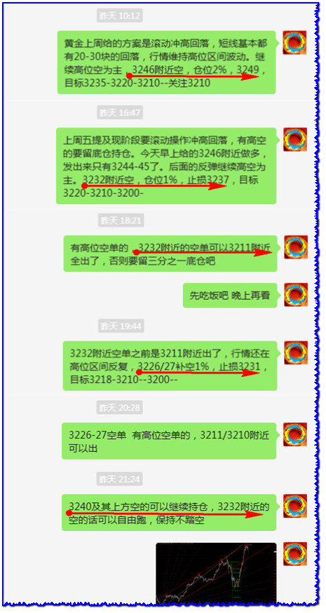 我们现在来看一下走势图,前期历史高点3167.50的下跌基本到了1.618位置和3x1线共振上行,这是我们这周提及的一个布局多头的位置,目前的话黄金是受制于前期2832上涨的上升通道上轨的压制,这点上周五强调过,从图中我们可以看出2832上涨以来基本所有的回落点都在该线上,所以,上周到本周通道线上轨反复回落,下方的话前期历史高点3167就成为次高点了,2956上涨突破3167.7的历史高点回踩的低点是3151美元,而3167.70美元之前的次高点是3149美元,那么,后市3150就成为比较关键的支撑了,回落下去的话不破3150还是要考虑继续低多黄金,如果破位3150的话,说明黄金要走调整了。昨天冲高回落,今天的话短线倾向于还是高空,3230压制冲高回落,或者3240左右冲高回落,做好对应的风控即可,短线下方的话关注一下昨天低点3192的争夺,没破之前短线也可以低多一下,破位风控。昨天黄金冲高回落,后面就关注走势能否延续出现下跌日吧。