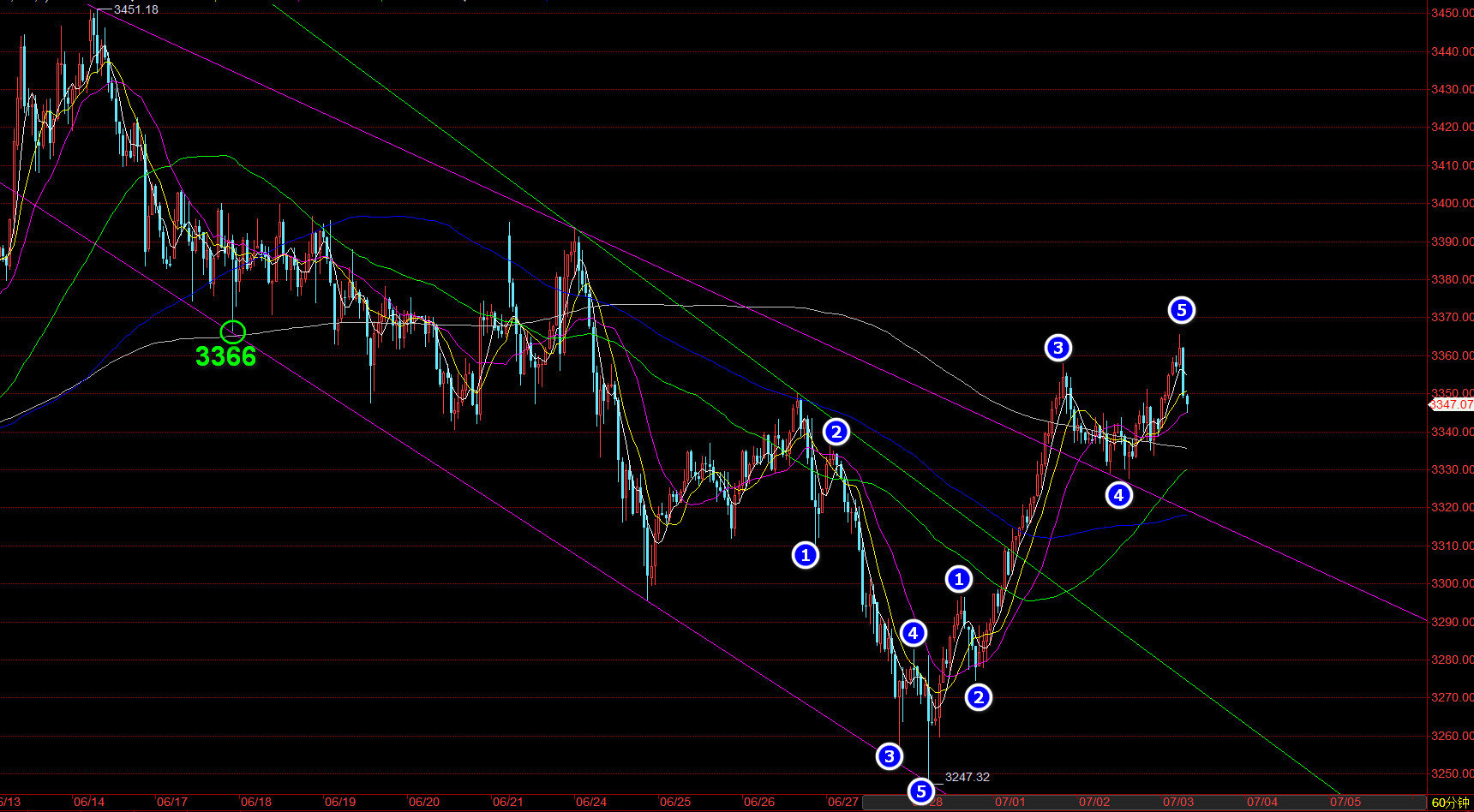 下面我们来继续看图,行情的运行驱动的时候都是5波走势或者是5波走势的复合结构,当我们看见一个明显5波走势出现,且空间还可以的,基本上就不好再追涨杀跌了。比如下图左边的下跌,由于之前趋势线是下跌,所以,3350的下跌周评提及就还要下跌砸个低点跌破3355才能反弹,因为还差个蓝5,蓝色5出来了自然就容易反弹了,这个时候再杀跌就容易空在低位了。现在看3246/47的上涨,截止今天早间基本上一个明显的5波上涨已经出来了,所以,昨天多单今早3360上方全了结了也是这种结构走势。