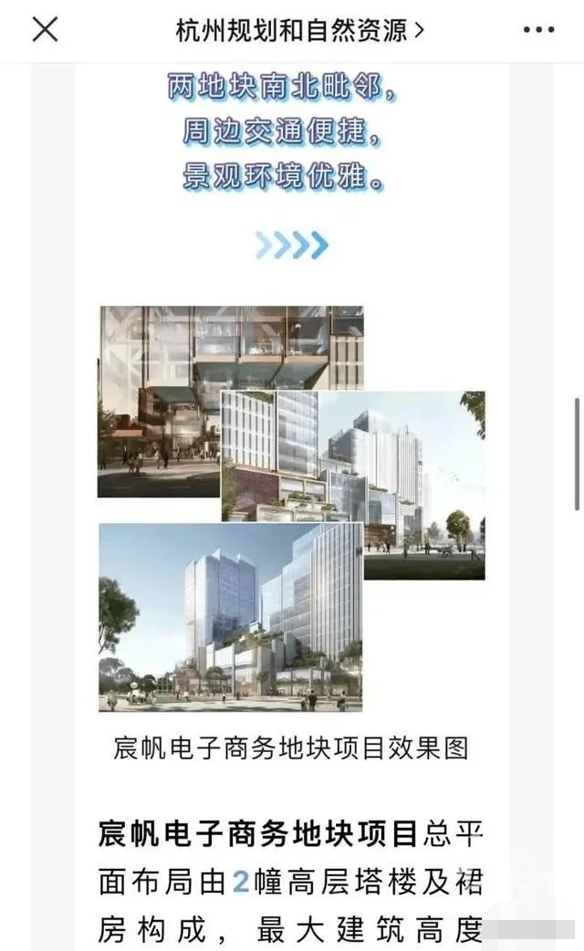 从杭州市规划和自然资源局的公告来看,宸帆电子商务地块项目总平面布局,由2 幢高层塔楼及裙房构成,总面积约9.7万平米。