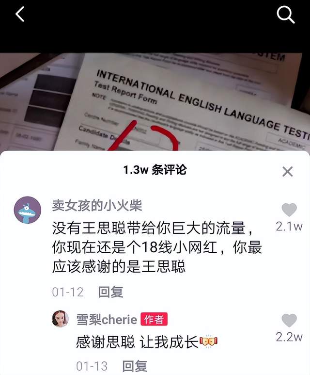 雪梨回复网友评论时说:“感谢思聪,让我成长”。