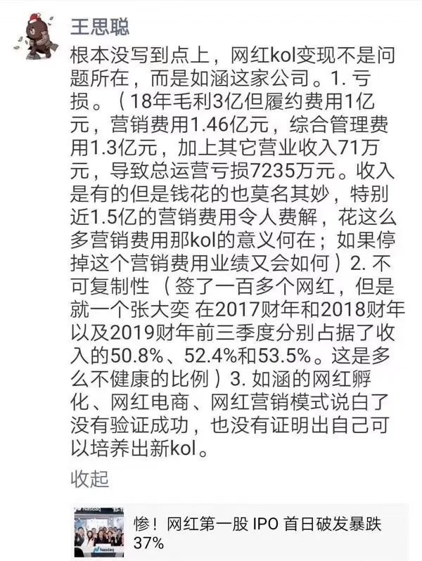 当时,张大奕所在的如涵上市破发,王思聪直接在朋友圈点评如涵大量亏损,营销费用过高,网红再造能力不行。