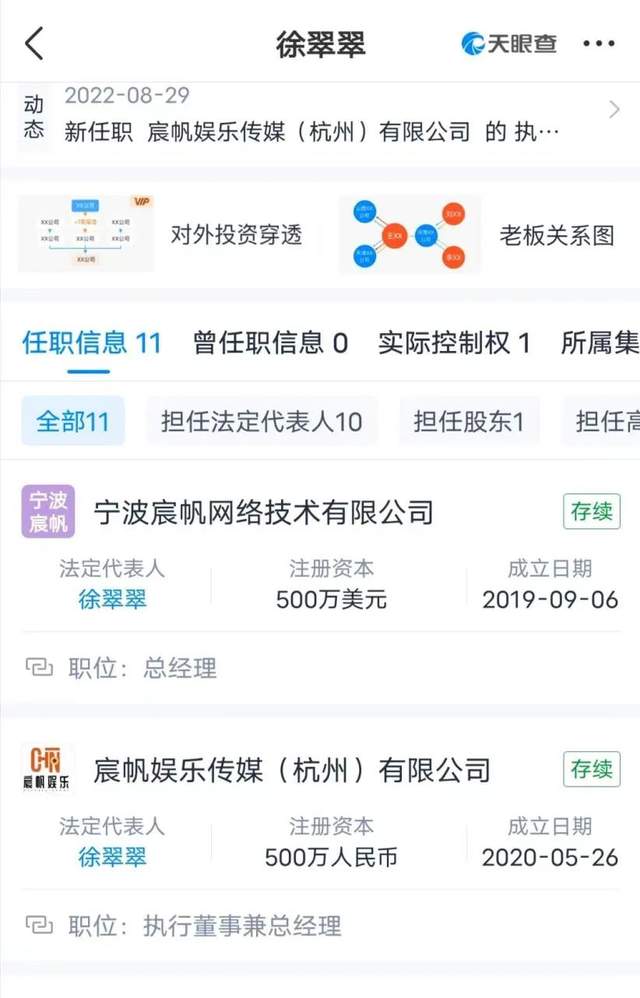 同时,徐翠翠还在“宸帆娱乐传媒(杭州)有限公司”、“宁波宸帆网络技术有限公司”中,担任法定代表人。而“宸帆系”多是与雪梨相关的企业。