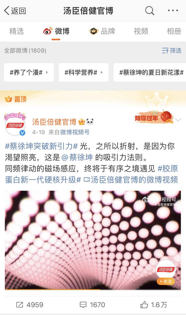 而在蔡徐坤塌房事件中,汤臣倍健反应也慢半拍,仍在微博置顶蔡徐坤代言广告,并未第一时间与其做切割。