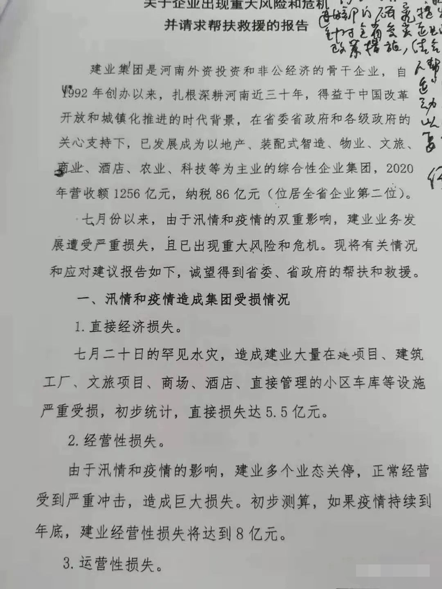 终于,到9月份,建业撑不住了,发出一封“求救信” ——《关于企业出现重大风险和危机并请求帮扶救援的报告》。信中说: