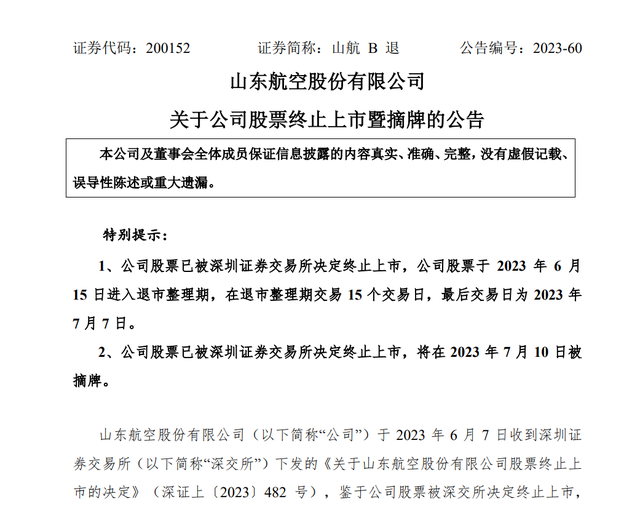 山航早在2000年便登陆B股市场,也是国内唯一一家B股上市航司,在2022年4月,因为2021年度期末净资产为负值,山航被发出退市风险警示,今年4月29日,2022年度报告显示经审计期末净资产为-78.07亿元,触发了终止上市情形。今年6月7日,深交所决定终止公司股票上市,公司股票于6月15日起进入退市整理期交易。