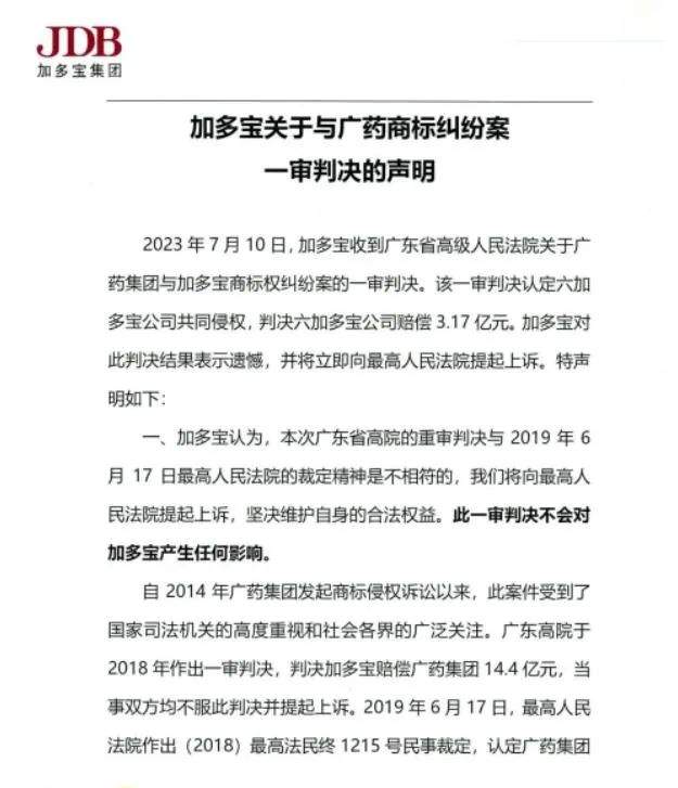 7月10日,加多宝发布《加多宝关于与广药商标纠纷案一审判决的声明》,称当天收到广东省高级人民法院关于广药集团与加多宝商标权纠纷案的一审判决。