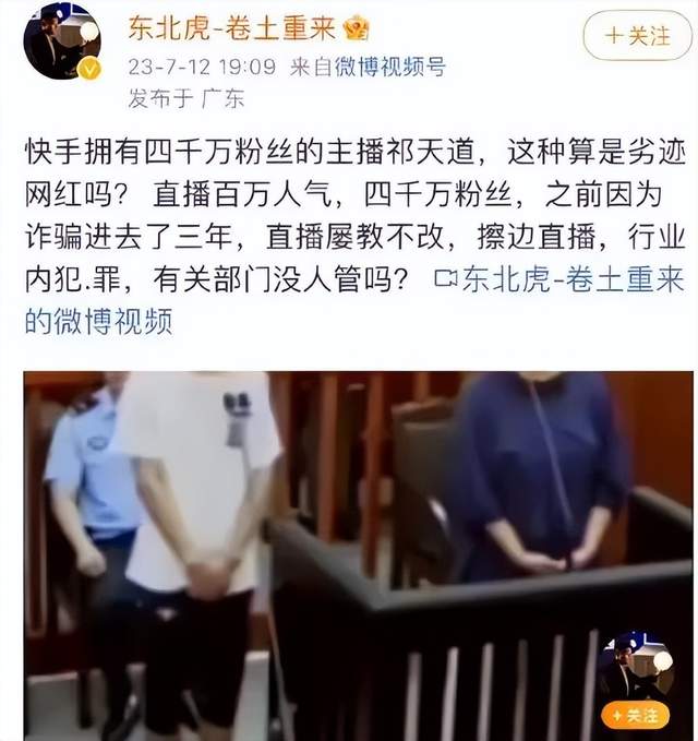 近日,名为“东北虎”的大V矛头直指曾因诈骗被判刑的网红“祁天道”,指其不应享有复出的权利,不仅放出了早期的庭审视频,还向北京政务中心进行了实名举报。