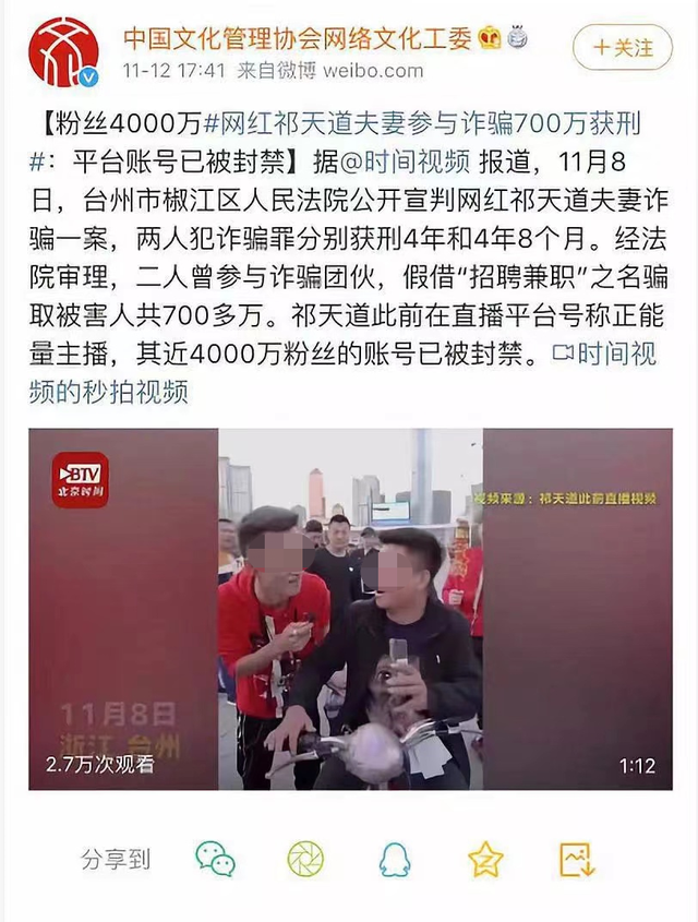 时间回到2018年7月,在快手坐拥4000万粉丝的“户外一哥”祁天道在直播时突然被警察带走。随后有消息曝出,在2014-2017年间,祁天道和他老婆王靖在直播平台假借招聘兼职人员之名,以收取会员费、服装费、培训费为由骗人钱财共计700万余元。